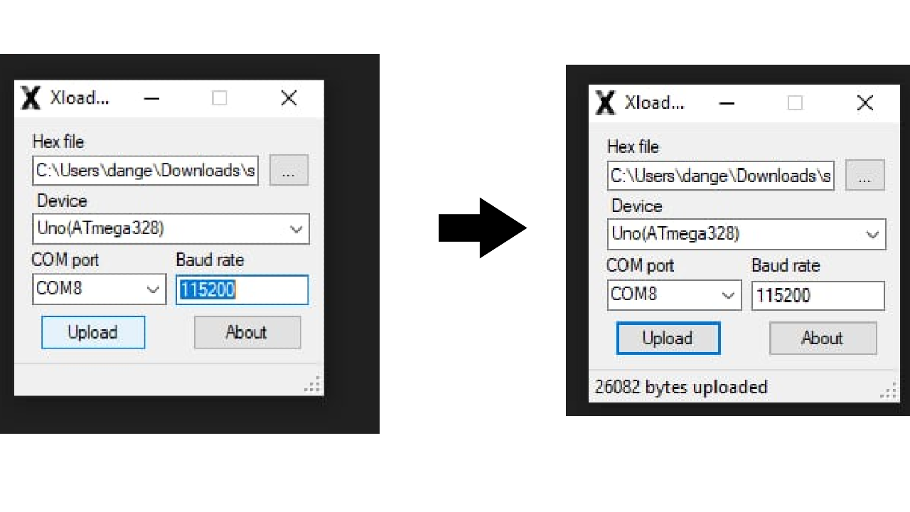 Open Xloader. Select the hex file you downloaded (serialcoinslot-xxxxx.hex). Set proper Device and COM PORT. Set Baud rate: to 115200. Then click Upload.